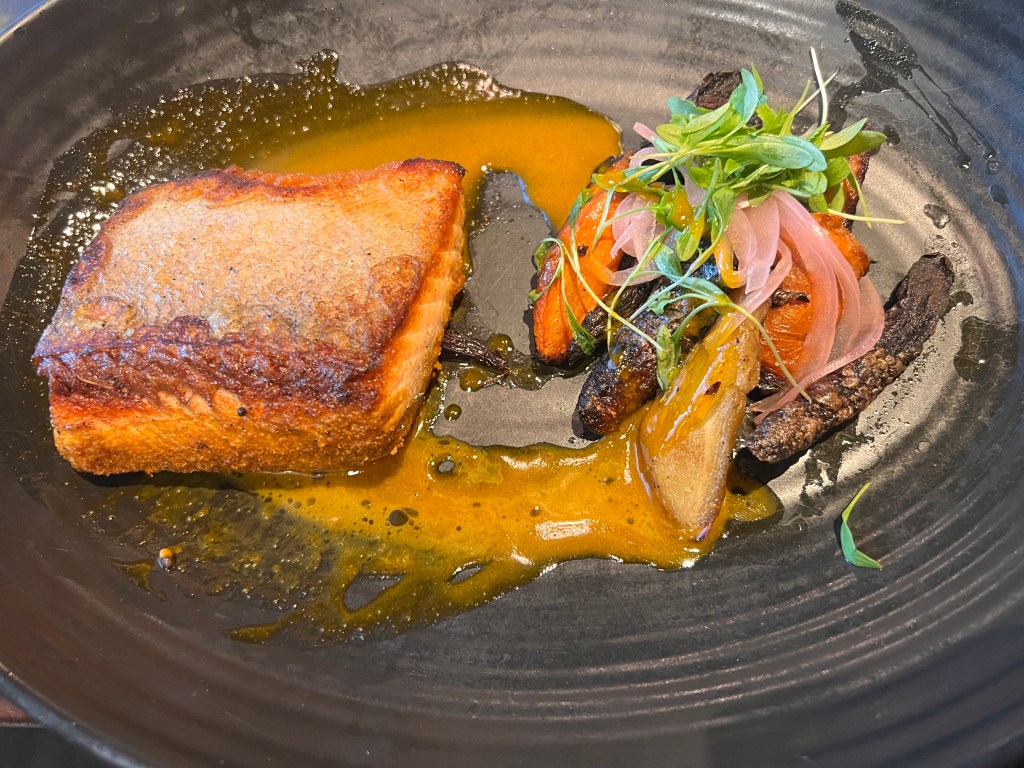 For my main course, I indulged in the Wild Columbia River King Salmon, perfectly cooked and paired with heirloom carrots and vadouvan curry butter. To celebrate International Burger Day, I also enjoyed a Bacon Cheddar Cheeseburger, topped with caramelized chipotle mayonnaise and served with crispy french fries. Each dish was a testament to the restaurant’s dedication to quality and flavor.