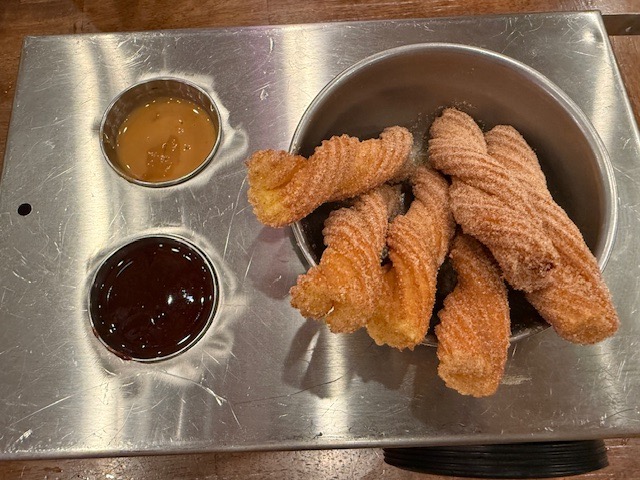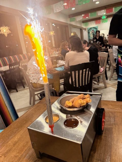 To conclude the fabulous dining experience, the churros came with a delightful show—firework sparklers that mirrored the Disneyland magic across the street. The warm churros were perfectly dusted with cinnamon sugar and served with dulce de leche and chocolate sauces, adding a sweet finale to the evening.