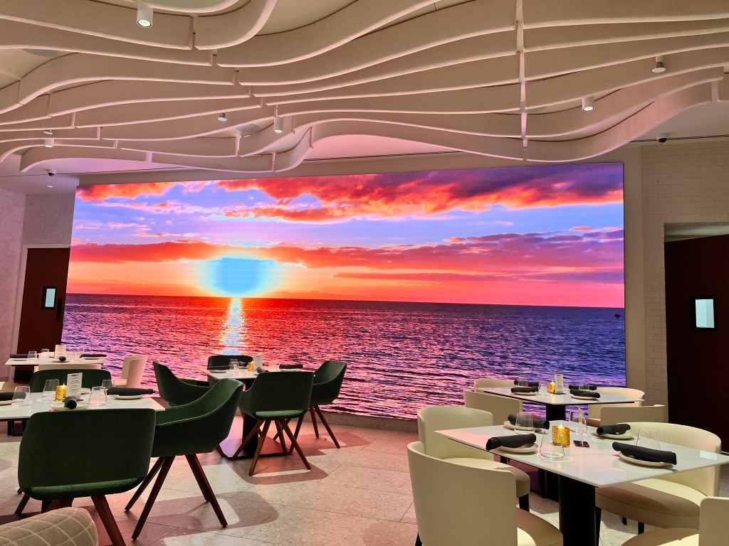 Your eyes are immediately drawn to the 30-foot LED digital art installation, a dynamic display of 3D visuals that range from crashing waves to serene beach sunsets and even wine glasses being filled in larger-than-life detail. This is Orange County’s latest upscale dining destination, where modern American cuisine meets an avant-garde atmosphere.
